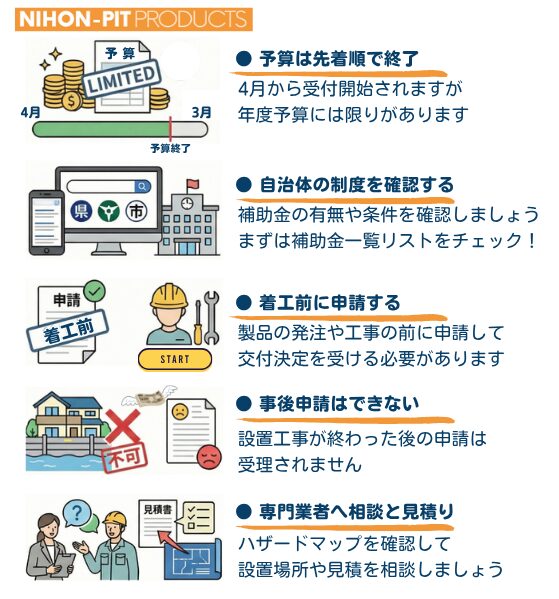 補助金を利用して浸水対策を行う場合、以下の点に十分ご注意ください。