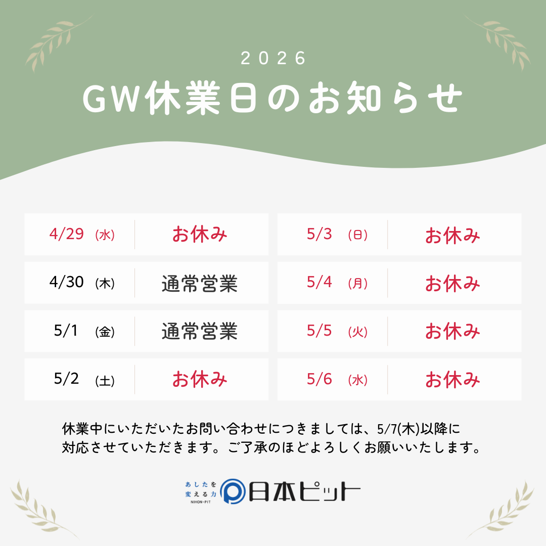 休業中にいただいたお問い合わせにつきましては、5/7(木)以降に、対応させていただきます。ご了承のほどよろしくお願いいたします。